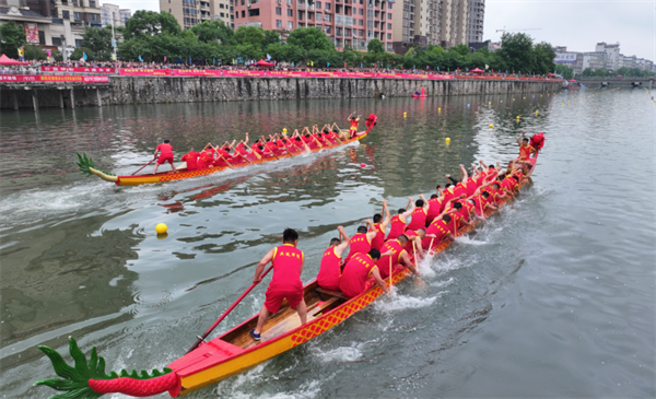 随着比赛正式开始,18支龙舟代表队、500余名运动员意气风发、激情逐梦,斑斓的龙舟如离弦之箭,劈波斩浪,在河面上留下一道道波痕,现场气氛瞬间被点燃。各队伍的龙舟健儿们挥桨如飞,似蛟龙出水,如百舸争流,以整齐划一的节奏击水飞舟,迎着浪花奋力前进,鼓声、水声、呐喊声交织成一首激昂的交响乐章。