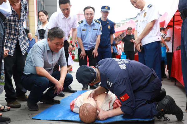 此外,萍乡市曙光救援队专业人员通过具体事故案例,详细介绍了突发情况下自救互救方法,并现场为居民们展示了心肺复苏、海姆立克急救法和逃生结绳打法等自救互救技能。消防人员通过实物展示、模拟佩戴、现场讲解的方式,介绍了灭火器材、应急装备的种类、使用方法及注意事项,并提醒现场群众关注身边的隐患,共同维护工作、生活环境的安全。