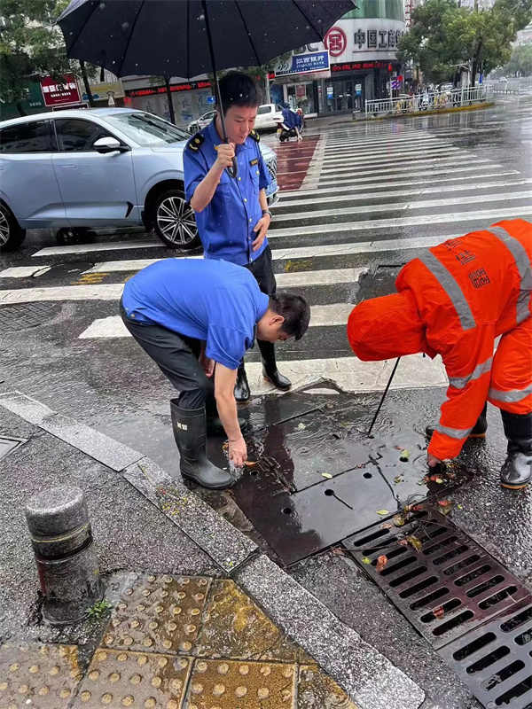 区城市管理服务中心对辖区内易发生内涝的地点进行水道管网排查与疏通工作,保障居民生活和出行安全。