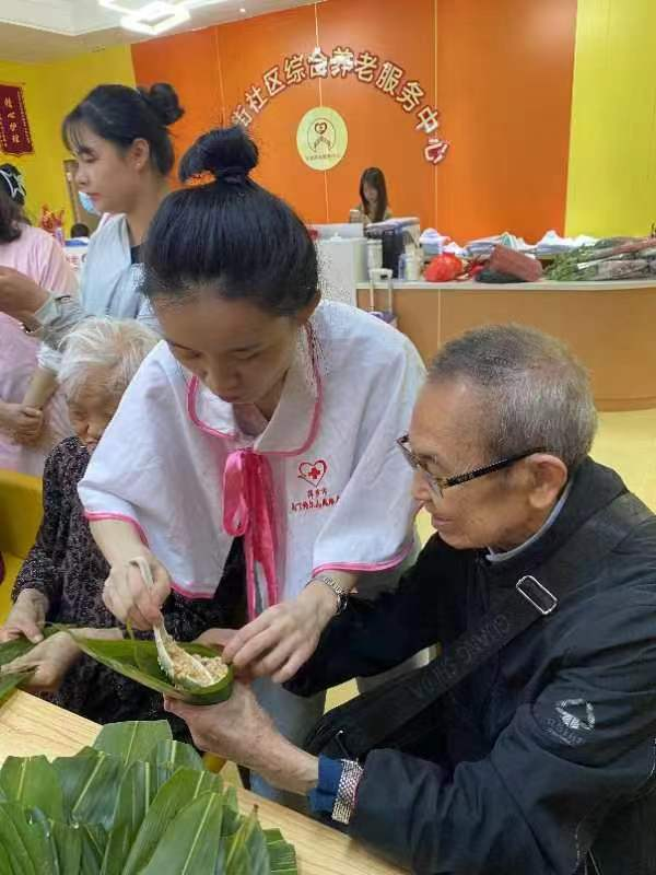 这边的中医健康义诊老人络绎不绝,另一边的包粽子活动也是热火朝天,我们医护人员中医义诊后并送上艾草的节日祝福,并和大家围聚一起共同包粽子。清香的粽叶裹上糯米、红枣、红豆、肉与浓情和祝福一同包裹,指尖翻转,不一会,一个个棱角分明。精致灵巧的端午粽子就堆满一盆。现场欢声笑语,其乐融融,让凤凰百姓养老院的老人们深刻体会到传统节日的气息,感受传统文化魅力。