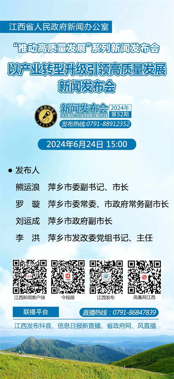 江西省人民政府新闻办公室将于6月24日15时,在省政府新闻办新闻发布厅举行“推动高质量发展”系列新闻发布会:以产业转型升级引领高质量发展新闻发布会。