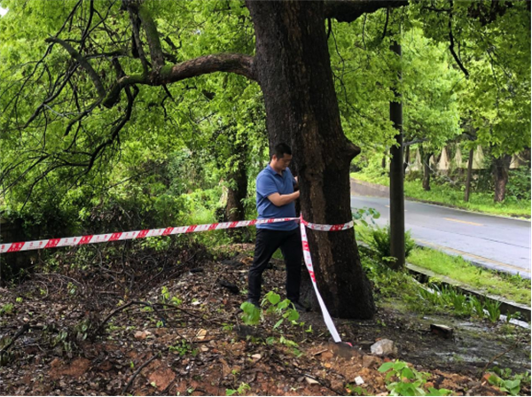 6月23日凌晨,汪公潭村党委接到组上村民反映自家屋后的大树倒塌在路上,非常危险。汪公潭村党委第一时间安排工作人员前往实地查看,大树倒塌在路中间,倒塌时还压倒了路灯,并且危及村民住房,如不及时处置,将对附近村民的出行和生命财产安全造成威胁。