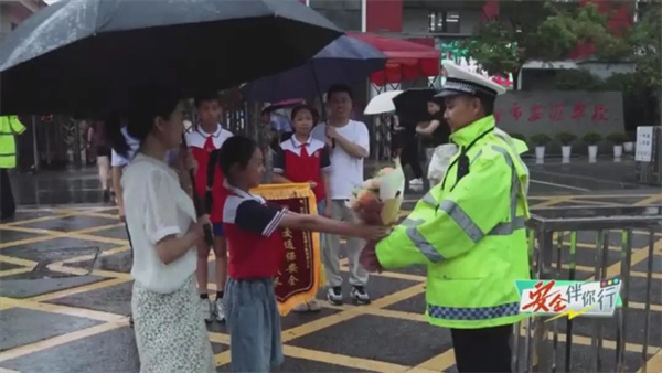 安源学校学生 钟佳明:每天上下学都能看到交警叔叔,像今天这样的大雨,他还坚守在马路上守护我们的安全,我很感激,也有点心疼。