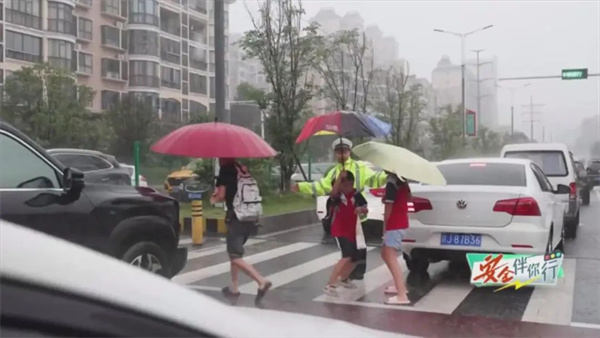 正值放学时间,王咏娇来不及和孩子们做更多交流,就继续投入到执勤中,一趟一趟护送孩子们安全过马路。尽管雨水模糊了视线,淋湿了衣裳,但王咏娇始终坚守在岗位上,履行着自己的职责。