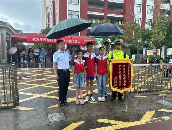 近日,安源学校上学期期终考试结束,在学校门口,安源交警大队民警王咏娇身穿反光雨衣,冒雨护送学生过马路。这时,几名学生代表在老师的带领下,手持鲜花锦旗向他走来......