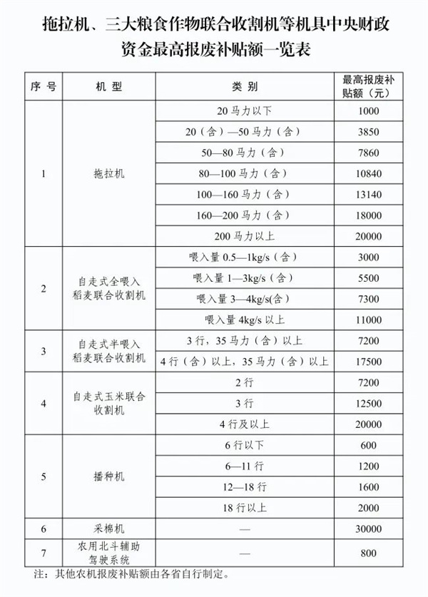 ● 拖拉机、三大粮食作物联合收割机、播种机和农用北斗辅助驾驶系统报废补贴额不超过本通知发布的最高补贴额,各省可在此基础上归并或细化类别档次,确定具体补贴额。