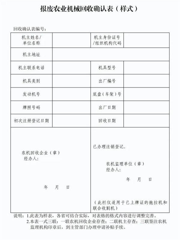 (一)报废旧机。机主自愿将拟报废的农机交售给回收企业。回收企业应当核对机主和拟报废的农机信息,向机主出具《报废农业机械回收确认表(样式)》(见附件2,以下简称《确认表》),向县级农业农村部门提供机主和报废农机信息。回收企业及时对回收的农机进行拆解并建立档案,对国家禁止生产销售的发动机等部件进行破坏性处理。拆解档案应包括铭牌或其他能体现农机身份的有关资料,保存期不少于3年。县级农业农村部门应对回收企业拆解或者销毁农机进行监督。