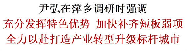 7月4日,省委书记尹弘深入萍乡调研,并召开座谈会听取萍乡市工作汇报。他强调,要深入贯彻习近平总书记考察江西重要讲话精神,聚焦“走在前、勇争先、善作为”的目标要求,充分发挥特色优势,加快补齐短板弱项,全力以赴打造产业转型升级标杆城市,坚定不移推动经济社会高质量发展。