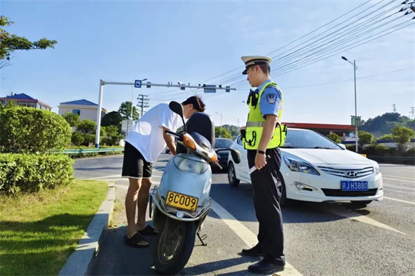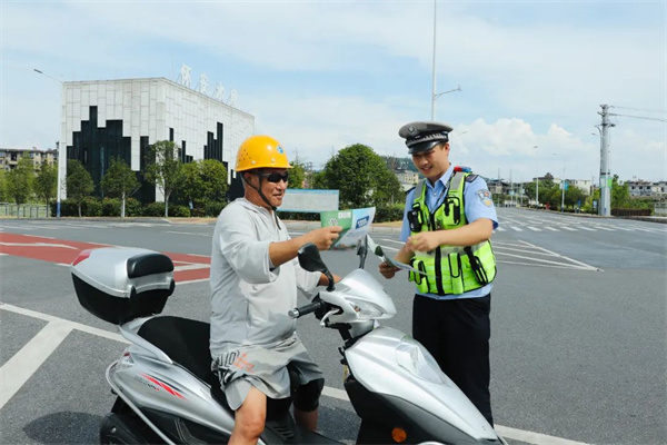 湘东交警大队执勤民警顶着烈日,在重点路段开展骑乘电动自行车不佩戴安全头盔集中整治行动。提醒摩托车驾乘人员天热也要戴头盔,养成佩戴头盔习惯,提高群众安全头盔佩戴率,预防和减少道路交通事故发生,最大程度保障人民群众生命财产安全。