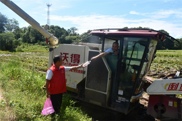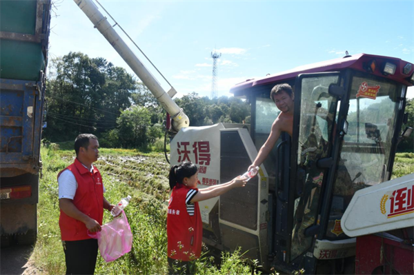 为了保障早稻顺利收割,排上镇机关干部和村“两委”共同组成志愿服务队,为这些“高温战士”送去防暑降温的物资。志愿者们深入田间地头,化身为“清凉使者”,看着农机手们在烈日下挥汗如雨,他们赶紧递上一瓶冰凉的矿泉水。农机手们纷纷表示,感谢志愿者们的关心和支持,这些防暑用品正是他们所需要的,让他们更有动力在高温下“战斗”,对今年早稻丰收充满信心。