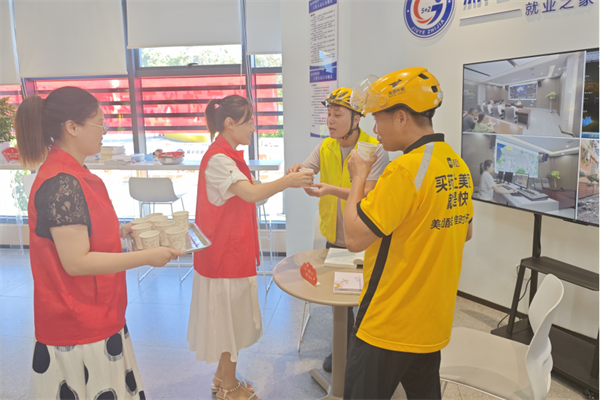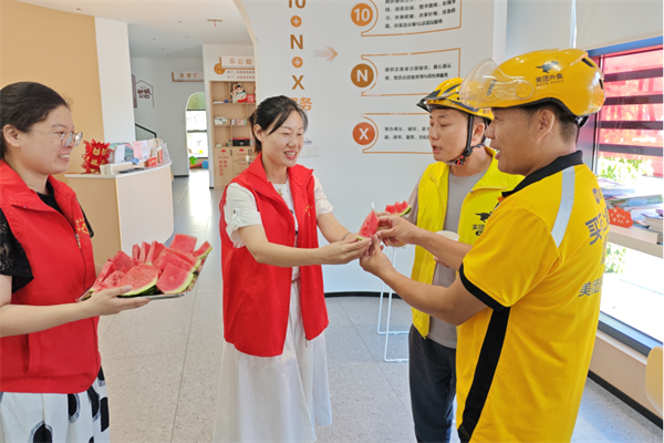 为给辖区一线工作者带来清凉与人文关怀,在峡山口街道新民社区城市驿站,志愿者为外卖员送上凉茶、西瓜等防暑降温食品。为给快递小哥、外卖骑手、环卫工人等户外劳动者们提供贴心的服务,城市驿站配备了藿香正气、风油精、毛巾、扇子等防暑降温用品,并通过微信群告知户外从业人员随时可以免费取用。