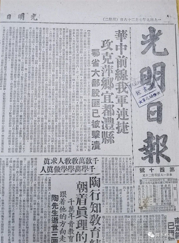 《光明日报》1949年7月26日,刊发消息“华中前线我军连捷攻克萍乡宜都灃县鄂省大部股匪已被击溃”。北平新华电台二十五日广播:华中前线人民解放军一连打下萍乡、宜都、灃县三座县城。