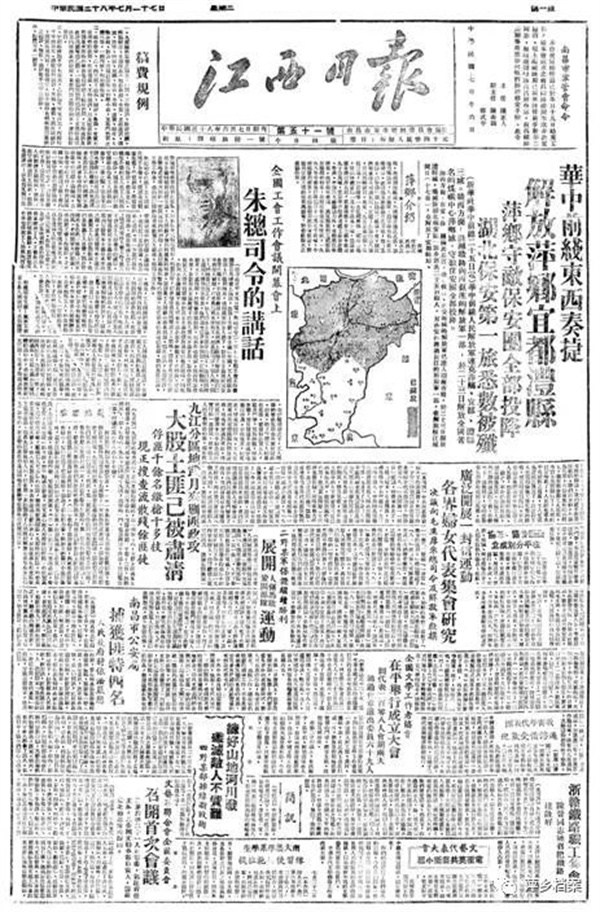 《江西日报》1949年7月27日,头版刊登“(新华社华中前线二十五日电)华中前线人民解放军连克萍乡、宜都、沣县三城。赣西方面:沿湘赣路向西挺进的解放军一部,于二十三日解放全国著名的煤矿中心萍乡城,守敌保安团全部投降。”