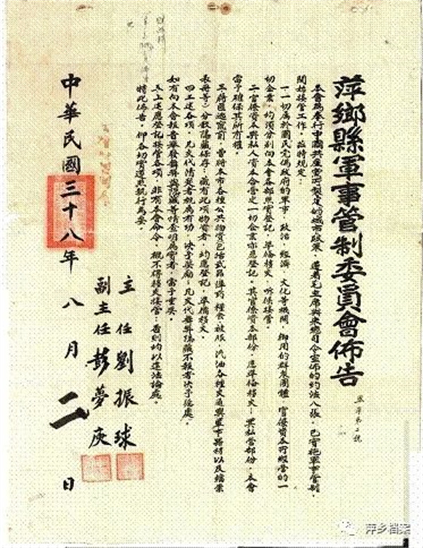 8月2日,萍乡县军管会颁发《关于实施军事管制开始接收地方工作的布告》,宣布:“本会为奉行中国共产党制定的城市政策,遵照毛主席与朱总司令宣布的约法八章,已实行军事管制开始接管工作。”萍乡市、县党政班子和军管会一道,在地下党组织的协助和支持下,顺利完成了政权交接工作。接管部的同志进入萍乡煤矿,仅用半个月的时间就圆满完成了接管任务,矿区迅速恢复生产。在解放军的有力配合下,县公安局几天内收缴国民党警察局、自卫队枪支近千支,并按照县委的部署,通过各种关系,收编了盘踞在大安里一带的国民党保安旅官兵500余名。与此同时,筹借粮草、恢复交通、支援前线等各项工作也全面展开,在短时间内,萍乡旧貌换新颜,呈现出一派欣欣向荣的景象。