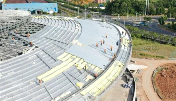 “临近中午的时候是最难熬的,金属屋面板在太阳照射下有时能够达到五六十摄氏度,我们为了防晒都穿着长袖长裤,为了防止意外事故还得戴着手套和安全帽,遮得严严实实的,还要暴晒在阳光下,衣服干了又湿,湿了又干。”劳务班组施工员刘思进说:“每次高空作业的时候都会做好安全措施,拴上安全绳,登顶后再拿出工具进行金属屋面板的安装。”萍乡奥体中心项目技术负责人于文辉介绍,为了克服高温作业的困难,保障工人的安全与健康,工人每工作一段时间,就会被安排到阴凉处休息;一旦有人感到身体不适,立即安排休息调整。高空作业也是安排至少两人一组,以便互相照顾身体状况,确保施工安全。