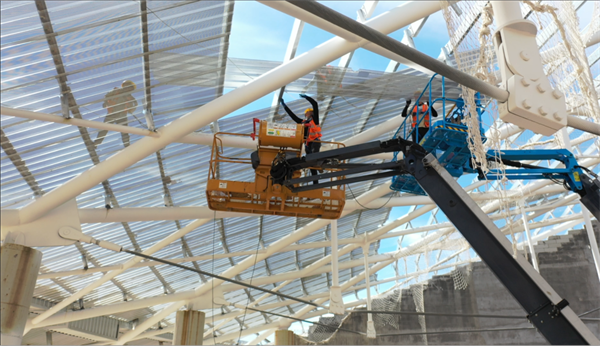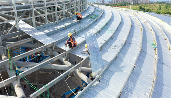 近日,在夏季高温的炙烤下,萍乡奥体中心体育馆的施工现场仍有不少工人在体育馆屋面上进行施工,工人们头顶烈日,在升降机作业人员的配合下,将一块块金属板安装在体育馆的屋面上。