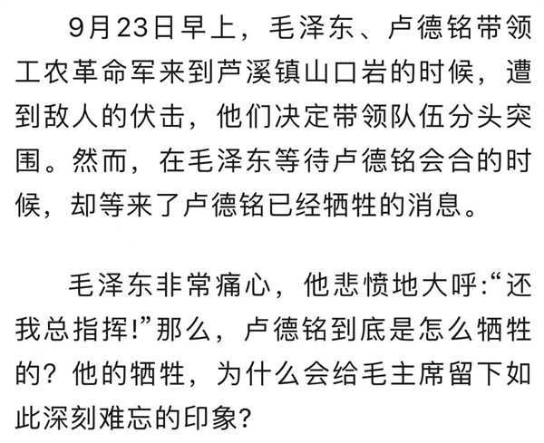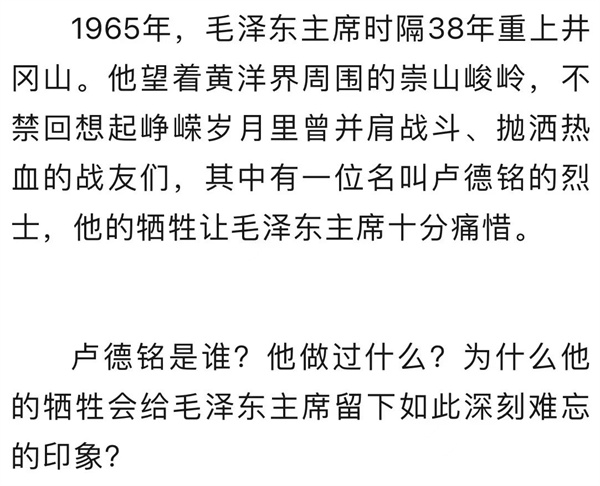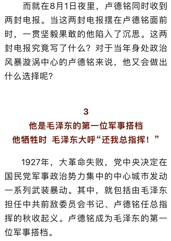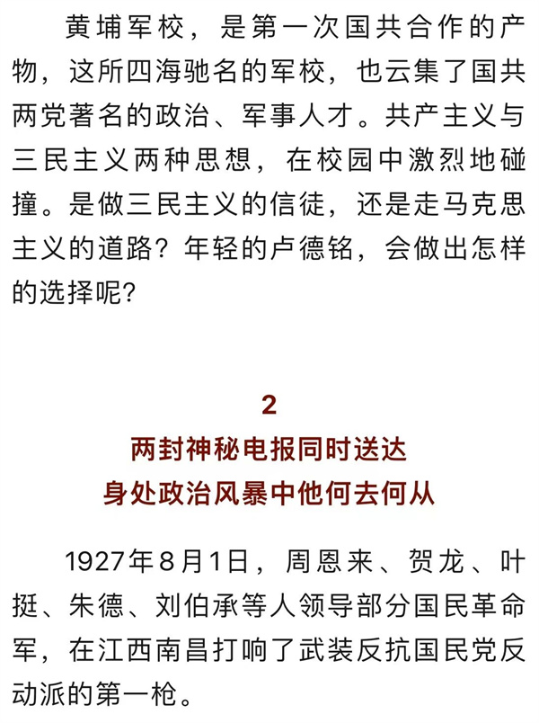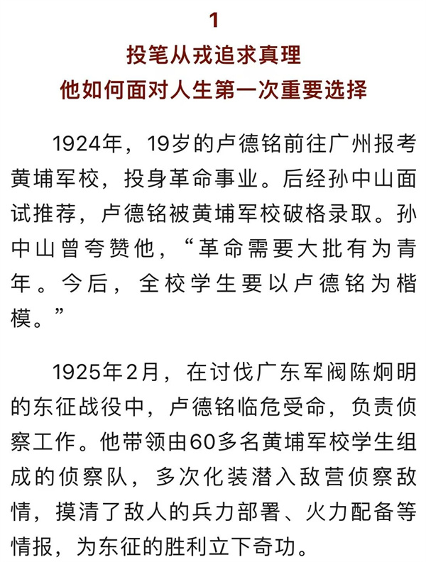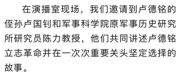 7月21日,《国家荣光——卢德铭》在央视综合频道(CCTV-1)、央视频APP播出。节目邀请了卢德铭的侄孙卢国钊和军事科学院原军事历史研究所研究员陈力教授,他们共同讲述卢德铭立志革命并在一次次重要关头坚定选择的故事。