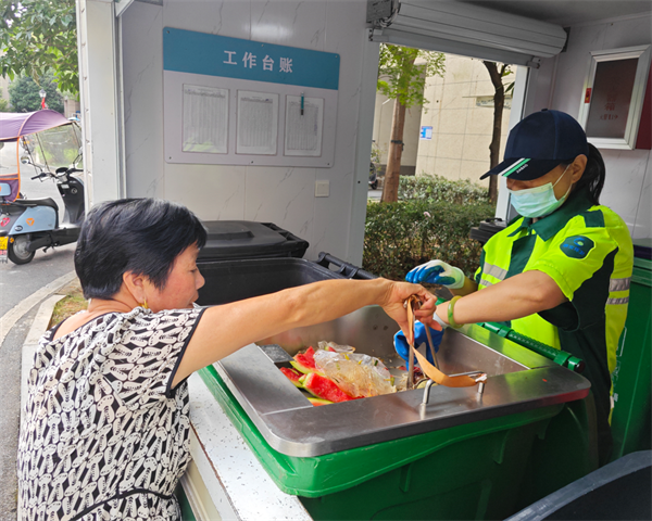 居民将家中的厨余垃圾与其它垃圾进行分类打包。