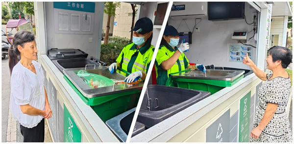 目前试点示范小区开展”两定四分一督“规范化流程服务,针对还没养成良好分类行为的居民,督导员会热情耐心的指导居民现场做好分类,讲解垃圾分类基本知识,通过专职督导员桶边督导+智能化的AI分类监管系统相结合,有效提高分类投放准确率。