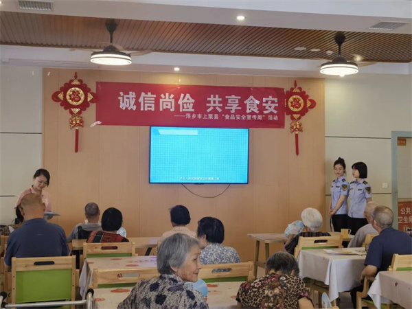 7月12日,在上栗县南北社区养老综合服务中心,工作人员通过播放食品安全宣传影片、发放宣传册、公众互动等方式给老人普及食品安全知识,同时提醒广大老年消费者正确认识保健食品,科学理性消费,切勿听信各类虚假夸大宣传。