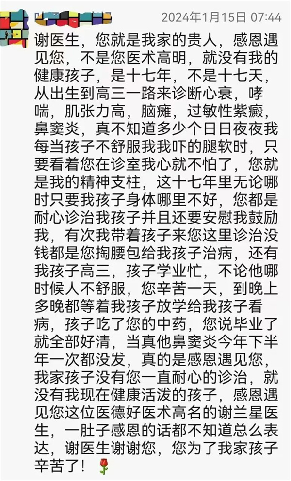 在工作中,他认真对待每一位患儿。有一位胡姓患儿,曾因重症肺炎、哮喘等反复多次住院,11个月大的时候找到谢兰星看诊,当时病情很严重,他用中西医结合的方法,治愈了患儿。从此,他便成为了这个孩子健康成长道路上的守护神。后来当孩子出现水痘、过敏性紫癜、慢性顽固性鼻窦炎、慢性咳嗽、反复高烧等病情时,家长都毫不犹豫地直奔他的诊室,在他的精心治疗下,孩子一路过关斩将,直至痊愈。十八年的时光,他见证了孩子从稚嫩的婴儿成长为朝气蓬勃的青年。