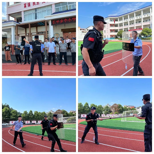 接着,上栗县巡警大队同志从实战需要着手,围绕防卫战术、防卫器械使用、巡逻盘查方法进行了技能培训。特别是针对校园区域在紧急情况下,警棍、催泪喷射器、防暴盾牌、钢叉、一键报警等警械、设备的基本使用技能、操作要领及注意事项进行了讲解和演示。