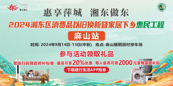第二场家居下乡活动展会,将于9月14日-15日在麻山镇桐田村停车场举办。扫码抢百万消费券、好礼抽奖、转发推文送大礼等活动在等着你。现场还有各大品牌的不同优惠及特价产品,千万别错过!