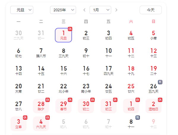 1月28日(农历除夕、周二)至2月4日(农历正月初七、周二)放假调休,共8天。1月26日(周日)、2月8日(周六)上班。