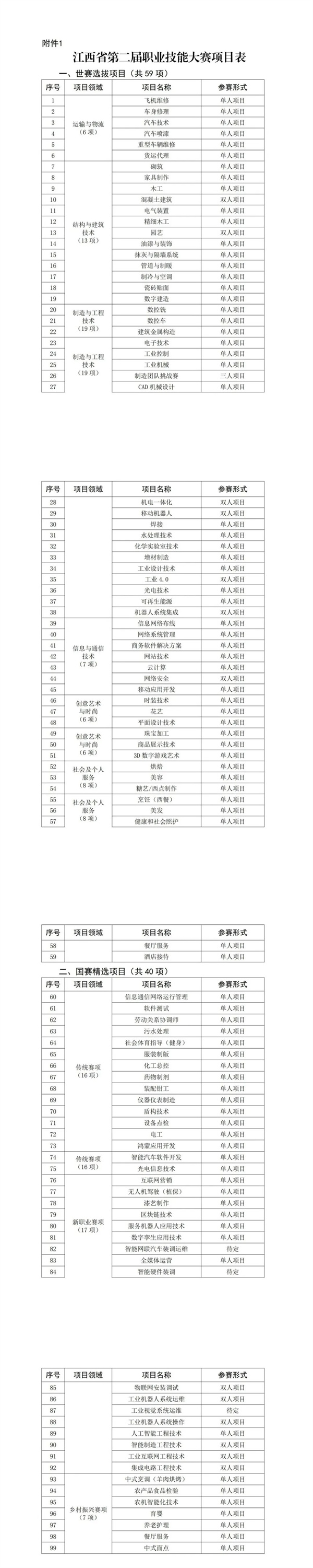 (一)竞赛项目。对接世赛、国赛,拟设竞赛项目99个,最终项目清单以大赛正式通知为准。