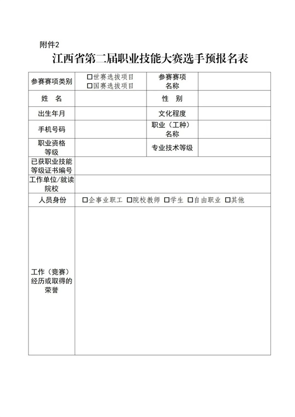 请报名的参赛单位或个人,于1月20日前将《江西省第二届职业技能大赛选手预报名表》Word文档及加盖公章的PDF扫描件发送至电子邮箱420426931@qq.com。中央驻萍单位、省属企业及省属院校按属地原则报名参赛。