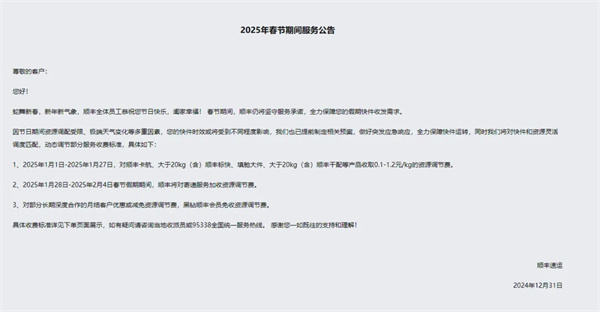 顺丰发布春节期间服务公告