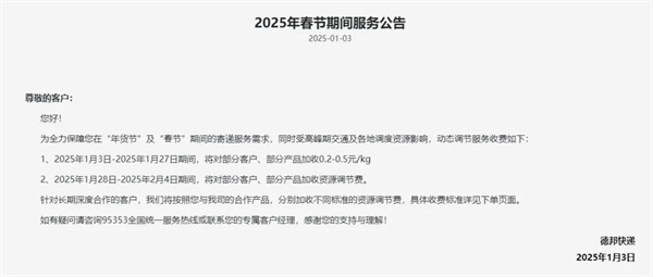 德邦快递春节期间服务公告