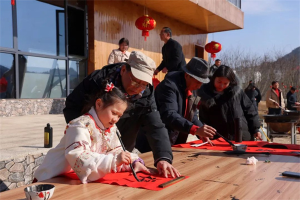 上午9时,位于楼溪湖畔的桃花岛已经人头攒动,村民们将灯笼挂上屋檐,春联夹上树梢,现场到处都透着过年的热闹劲儿。在场地中央,村里书法精湛的老人们早已摆好桌案,墨香四溢间,笔锋游走如龙蛇“一帆风顺年年好,万事如意步步高。”“喜居宝地千年旺,福照家门万事兴。”一副副饱含祝福的春联在他们笔下一气呵成,引得周围村民不时发出阵阵赞叹。