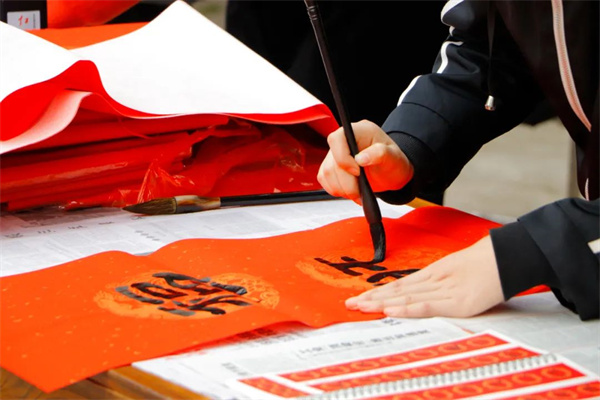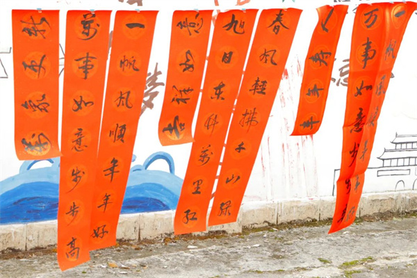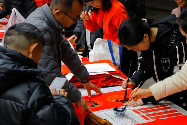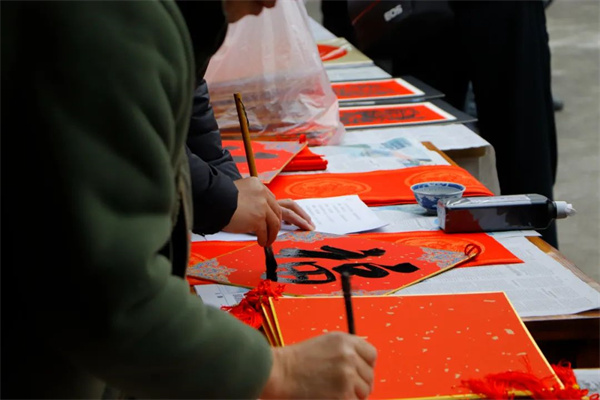 艺术家们精心挑选对仗工整、寓意祥和的内容,目注心凝,压纸、沾墨、提笔、收笔……草书的流转飞扬,行书的洒脱飘逸,楷书的端庄秀丽,隶书的庄严凝重,篆体的浑厚朴茂,“民安国泰逢盛世,风调雨顺颂华年”“一帆风顺全家福,万事如意满门春”“风和日丽春常驻,福寿年丰福永存”“龙腾盛世千家喜,蛇舞新春万户欢”......一幅幅寓意吉祥祝福的春联和一张张饱含神韵的“福”字跃然纸上。