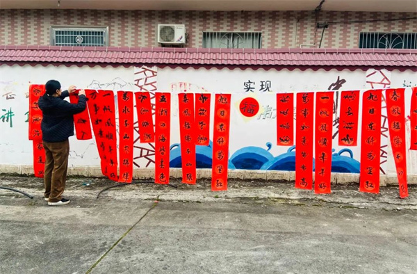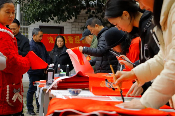 艺术家老师在现场不仅为村民们书写了传统的春联,还根据村民们的个性化需求,创作了具有现代气息和个性特色的春联作品。村民们纷纷表示,这些春联不仅美观大方,更蕴含着深深的祝福和美好的愿景。浓浓的墨香与村民们的欢声笑语与火热的中国红交织在一起,到处洋溢着喜庆的气氛。