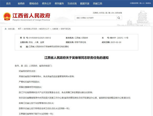吴维任省医疗保障局局长,免去其省药品监督管理局局长职务;