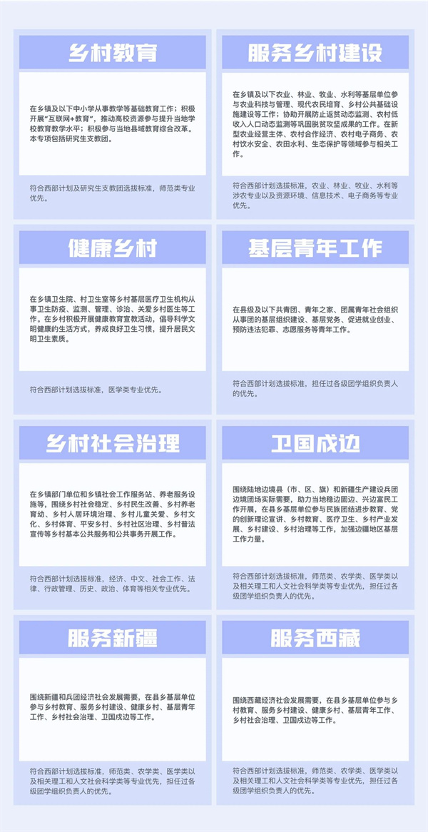 西部计划设乡村教育、服务乡村建设、健康乡村、基层青年工作、乡村社会治理、卫国戍边、服务新疆、服务西藏等8个专项,90%以上服务岗位设置在乡镇及以下。西部计划志愿者服务期为1至3年,服务协议一年一签。为激励志愿者服务期满继续扎根基层,国家在升学、就业、培训培养等多个方面给予政策支持。