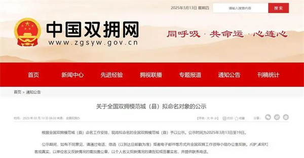 根据全国双拥模范城(县)命名工作安排,现将拟命名的全国双拥模范城(县)予以公示。公示时间为2025年3月13日至19日。