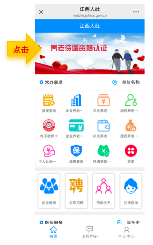 点击赣服通首页“热门服务”左下方的“养老认证”。