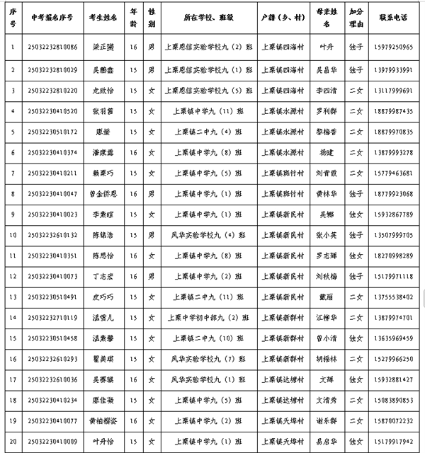 根据《江西省农村二女不再生育和农村独生子女家庭子女中考优惠加分的实施办法》(赣府厅[2004]22号)以及萍乡市人口计生委、萍乡市教育局《关于认真做好我市农村二女不再生育和农村独生子女家庭子女中考优惠加分工作的通知》(萍人口字[2006]20号)文件精神,经镇村两级推荐审核,上栗镇2025年度拟报审农村二女户及农村独生子女家庭户子女申请中考优惠加分对象如下: