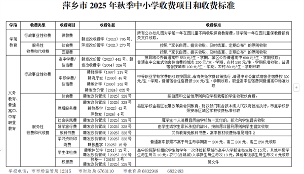 临近开学,萍乡市教育局、萍乡市发展和改革委员会、萍乡市财政局、萍乡市市场监督管理局四部门联合印发了《关于认真做好2025年秋季开学收费工作的通知》(萍教发〔2025〕6号),现将萍乡市2025年秋季中小学收费项目与标准公布如下。
