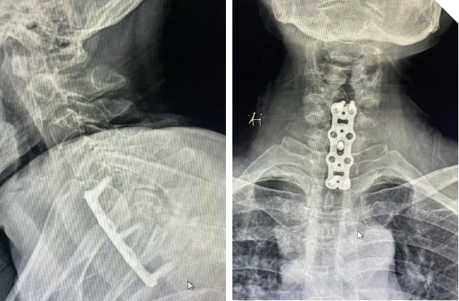 在饶放萍主任医师的带领下,手术团队配合娴熟,凭借丰富的临床经验与精湛的手术技艺,精准定位病灶位置,彻底清除病灶组织,同时进行椎管减压,充分解除脊髓压迫。为确保颈椎的稳定性,还从患者自身髂骨取骨,进行结构植骨并实施内固定。整个手术过程紧张有序,通过专家团队近2小时的“精雕细琢”,终于大获全胜!
