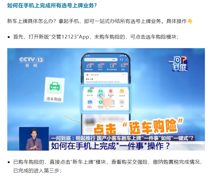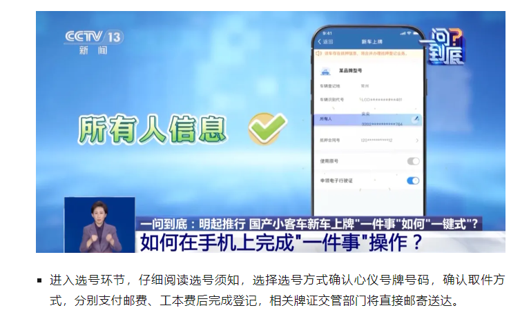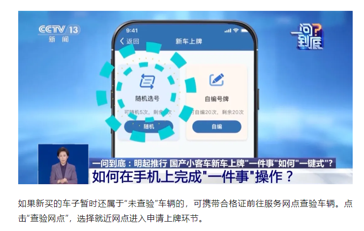 公安部交通管理局车辆和驾驶人管理处处长王国强表示,此次改革后,公安交管部门会和已经实现预查验车辆的车企共享新车查验信息,群众可直接在线上办理选号上牌等业务,无需再将车辆行驶到车管所交验。