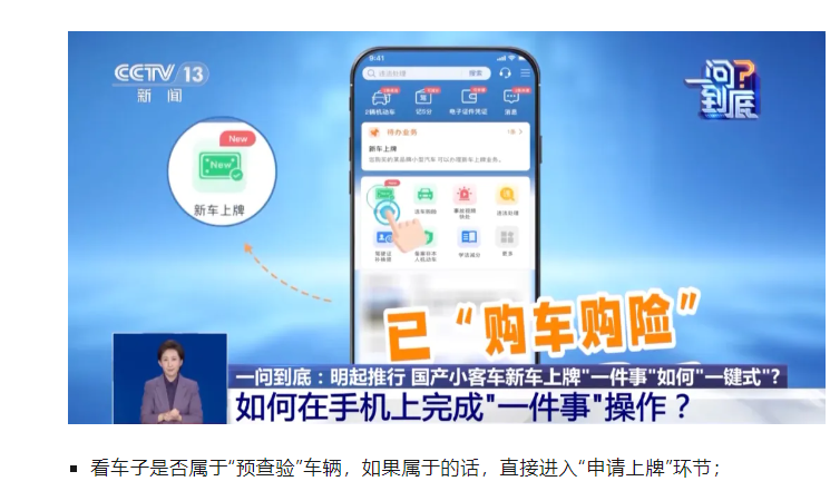 国产小客车新车上牌“一件事”,指的是把购买新车之后,需要开具交易发票,购置保险,缴纳购置税、选号上牌、去车管所排队验车等多件事,合并成一件事,车主登录“交管12123”手机App,即可一站办结。