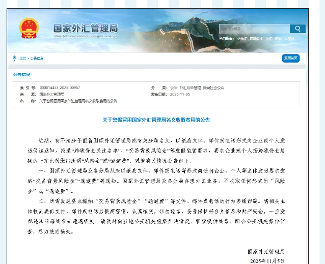 11月5日,国家外汇管理局发布关于警惕冒用国家外汇管理局名义收取费用的公告。公告指出,近期,有不法分子假冒国家外汇管理局或有关分局名义,以纸质文件、邮件或电话形式向企业或个人发送伪造通知,捏造“跨境资金关注名单”“交易背景风险金”等虚假监管要求,要求企业或个人按跨境资金总额的一定比例缴纳所谓“风险金”或“通道费”。