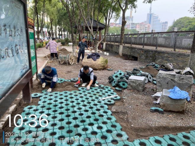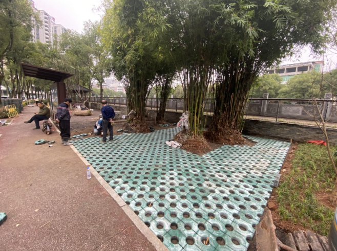 原来这里的竹丛与灌木带、草地交织,虽有绿意却未能充分融入市民的日常休闲需求。如今,改造工程正精准发力:园林施工队细心疏通竹丛,让空间更显通透;全面清理灌木与草地,腾出开阔活动区域;铺设植草砖,既保留绿意生机,又打造坚实实用的活动场地,彻底激活“绿地共享”的核心价值。