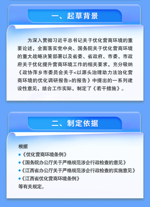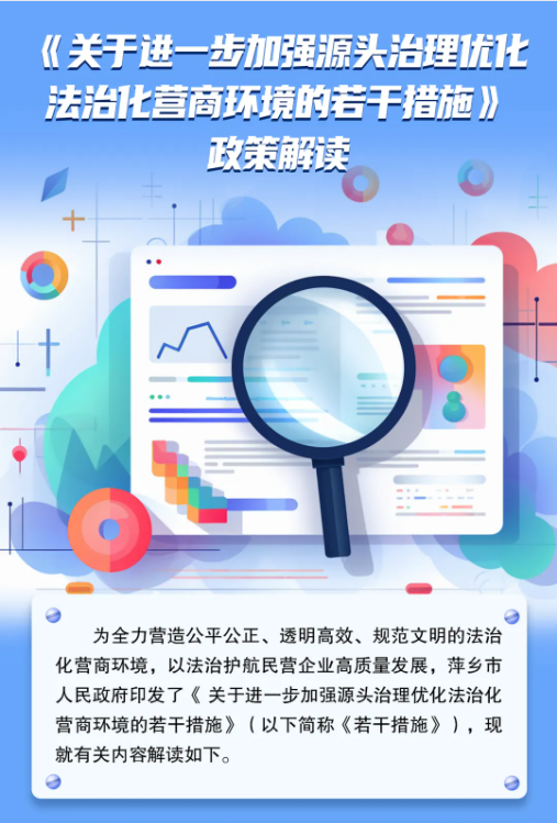 为深入贯彻市委、市政府关于优化营商环境的决策部署,坚持问题导向与目标导向,强化系统施治,从源头上整合各方资源,提升法治化营商环境建设水平,助力萍乡产业转型升级,进一步助推经济高质量发展,制定如下措施。