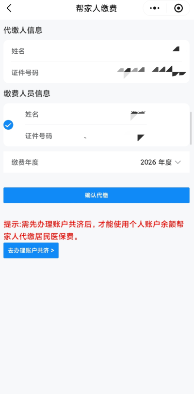 返回首页,点击进入【帮家人缴医保】,点击选择需要代缴纳医保费用的家人,选择缴费年度,此处请大家选择2026年度,然后点击【确定代缴】,即可完成给家人缴纳医保费用。此处请务必确认您选择的家人尚未通过其他方式已 缴纳医保,否则将导致重复缴费。