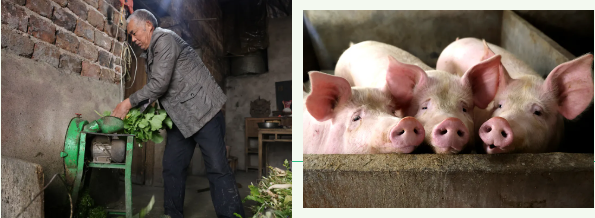 在他用于养猪的一栋老平房内,大厅里摆放着两台小机器,用于粉碎青菜和番薯。侧房地面堆了些番薯,后屋灶上的大铁锅正煮着猪食。“下午弄好青菜,第二天早上不到六点就开始煮食,一天要煮满三大锅。”他语气平静,透着认真。