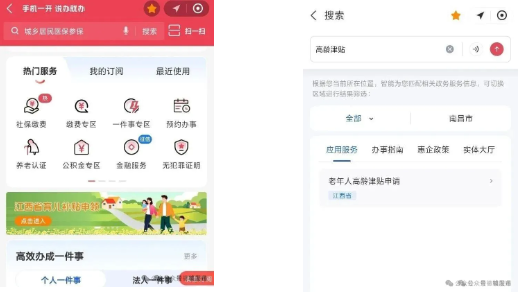 2.首页点击搜索,输入高龄津贴,点击进入服务。